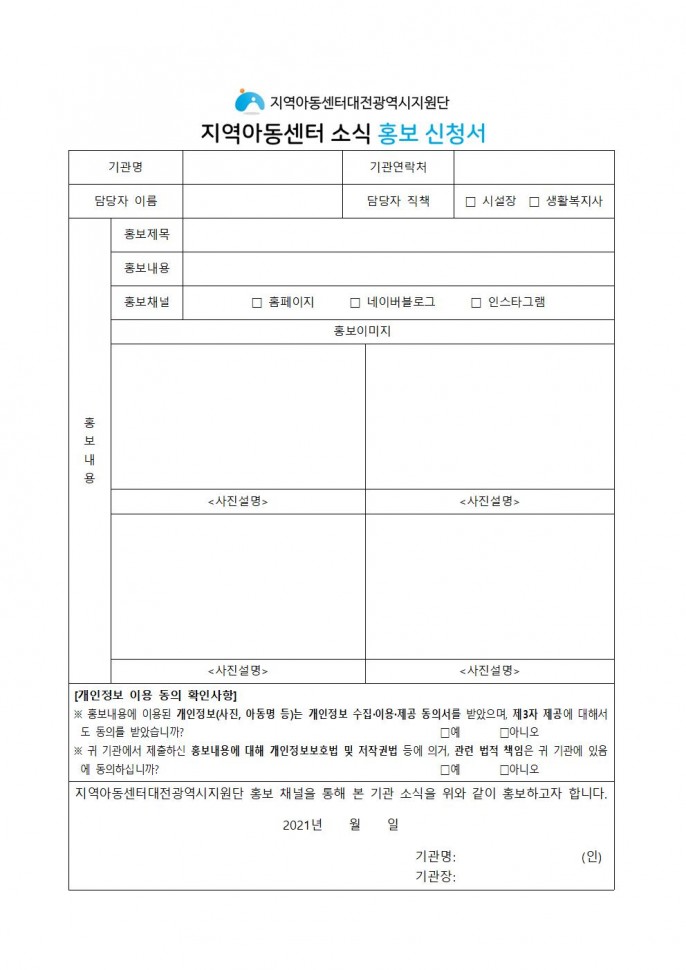 지역아동센터 소식 홍보 신청서를 붙임과 같이 첨부합니다.
